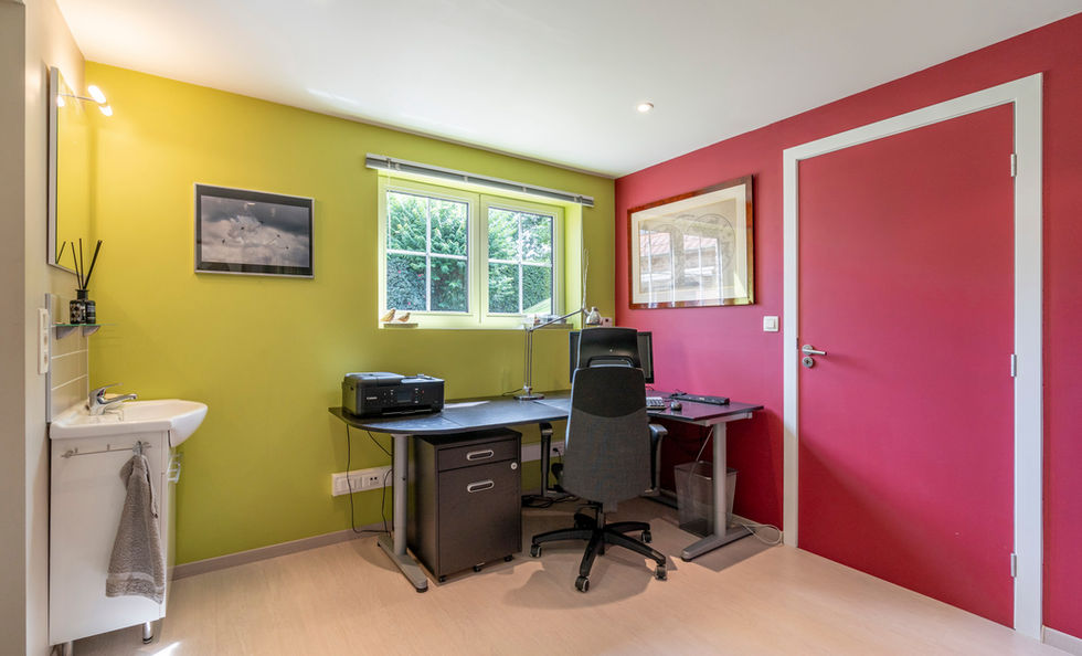De villa biedt vier slaapkamers op de eerste verdieping, elk met eigen uitstraling, en waarvan één met extra wastafel. De badkamer is voorzien van een dubbele lavabo, een bad en een douche. Een praktische opbergzolder bevindt zich onder het dak, ideaal voor extra opslagruimte. Daarnaast beschikt de villa over een bijgebouw, ingericht als thuisbureau en volledig afgesloten van het hoofdgebouw, wat privacy en rust biedt. De woning beschikt over een conforme elektriciteitskeuring en is asbestveilig verklaard.