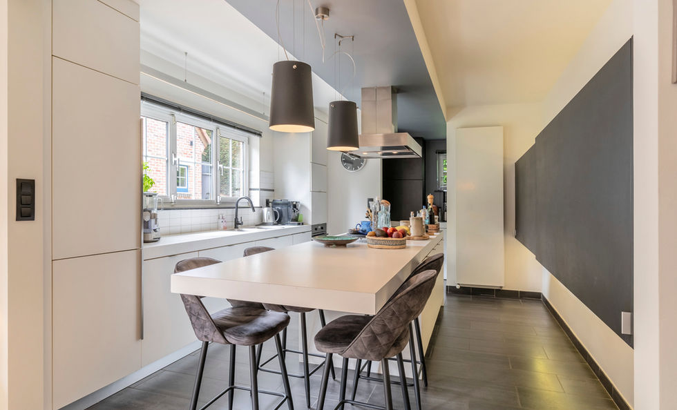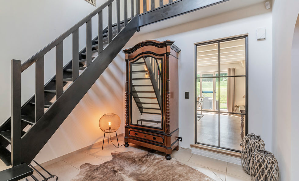 Bij binnenkomst betreedt u een inkomhal met een stijlvolle trap, toegang tot een gastentoilet, en een dubbele garage met elektrische toegangspoorten. De leefruimte is het absolute pronkstuk van de woning: een schitterende, open ruimte met prachtig parket, waar de eetkamer, zithoek met sfeervol haardvuur, bureauruimte en open leefkeuken samenkomen. Dankzij de natuurlijke lichtinval, de directe toegang tot het zonnige terras op het zuidwesten, en de hoger gelegen tuin, geniet u hier van een buitengewone woonbeleving.