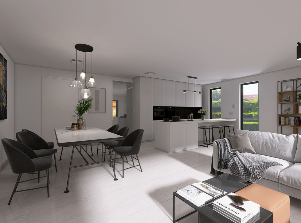 Aan de hand van deze 3D-vastgoedvisualisaties geven we potentiële kopers de kans om het volledig potentieel te zien van de leefruimte en keuken in van deze af te werken woning in Erps-Kwerps.
